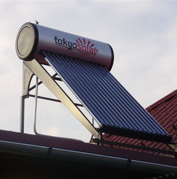 150 litrový vákuový tlakový solárny systém s 15 vákuovými trubicami s technológiou Heat Pipe. S magnéziovou tyčou a elektrickou špirálou.